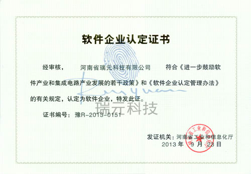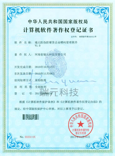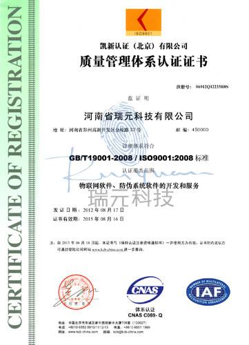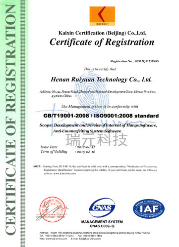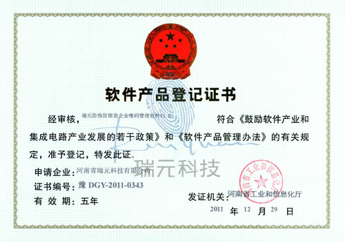 河南省瑞元科技有限公司软件产品登记证书河南省瑞元科技有限公司软件企业认定证书河南省瑞元科技有限公司ISO 9001 中文版认证证书河南省瑞元科技有限公司ISO 9001 英文版认证证书瑞元科技防伪防窜货喷码软件著作权登记证书